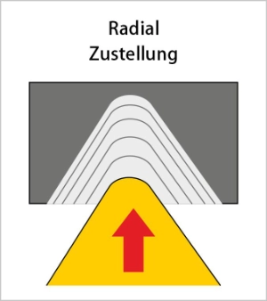 Mehrstufiger Schnitt: Die CNC-Steuerung teilt den Gesamtschnitt automatisch in mehrere Durchgänge auf. Dabei werden Schrupp- und Schlichtdurchgänge unterschieden.