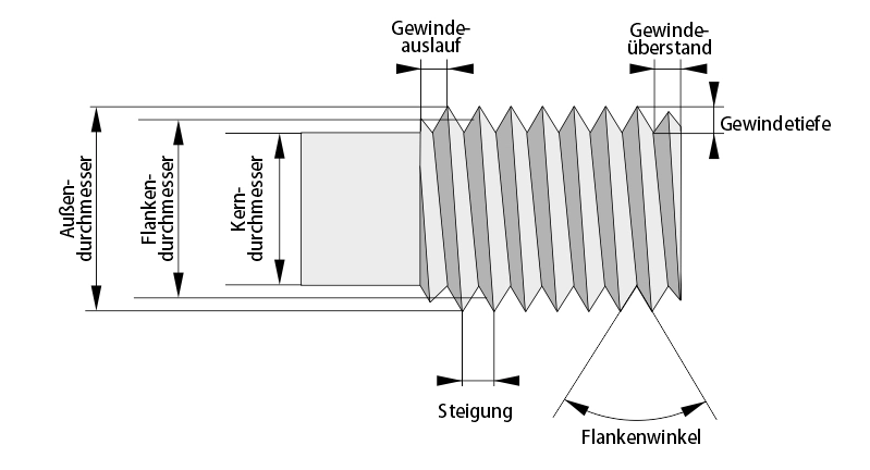 Der Außendurchmesser ist der größte Durchmesser des Außengewindes, gemessen über die Gewindeberge. Er entspricht dem Nenndurchmesser des Gewindes und wird zur Bezeichnung verwendet. Der Kerndurchmesser ist der kleinste Durchmesser des Außengewindes, gemessen am Gewindegrund. Er ist entscheidend für die Zugfestigkeit der Schraube, da hier der kleinste Querschnitt vorliegt. Die Differenz zwischen Außen- und Kerndurchmesser entspricht der doppelten Gewindetiefe.