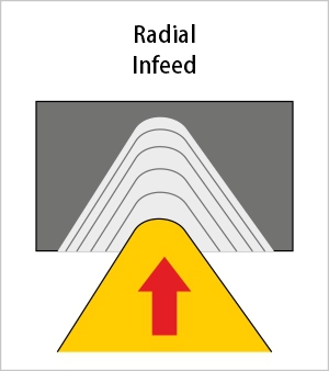 Combination of radial infeed for rough machining and flank infeed for finish machining.